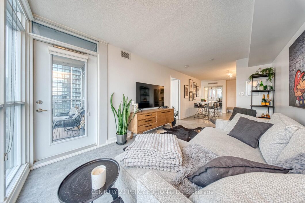 Bright and well-maintained corner unit featuring updated grey vinyl flooring and a modern kitchen with stainless steel appliances. Floor-to-ceiling windows on two sides provide abundant natural light and an airy feel. The unit includes a conveniently located parking spot on P2near the elevators, a large cage locker situated between the parking and elevators, and access to recently renovated building common areas with updated hallway carpets and walls completed in 2025. Can come furnished as well. Inquire for details.